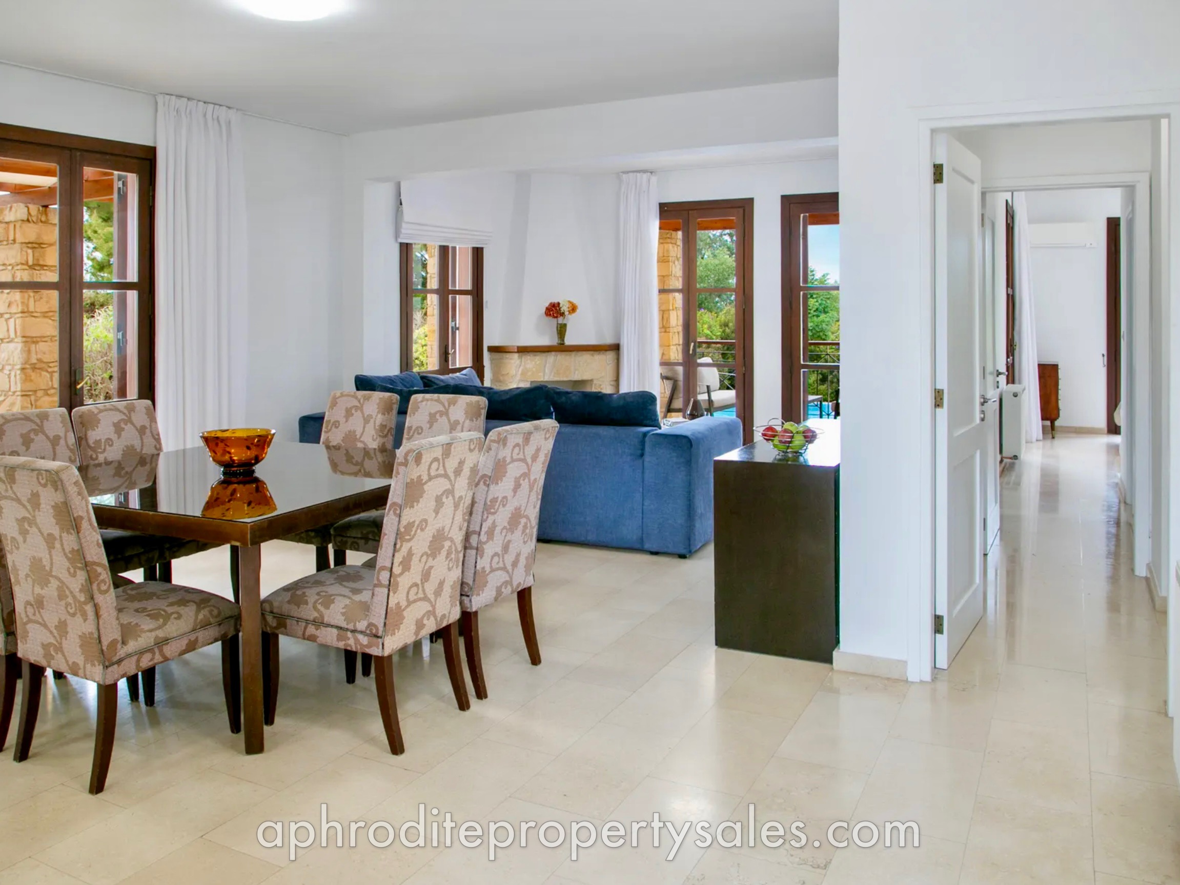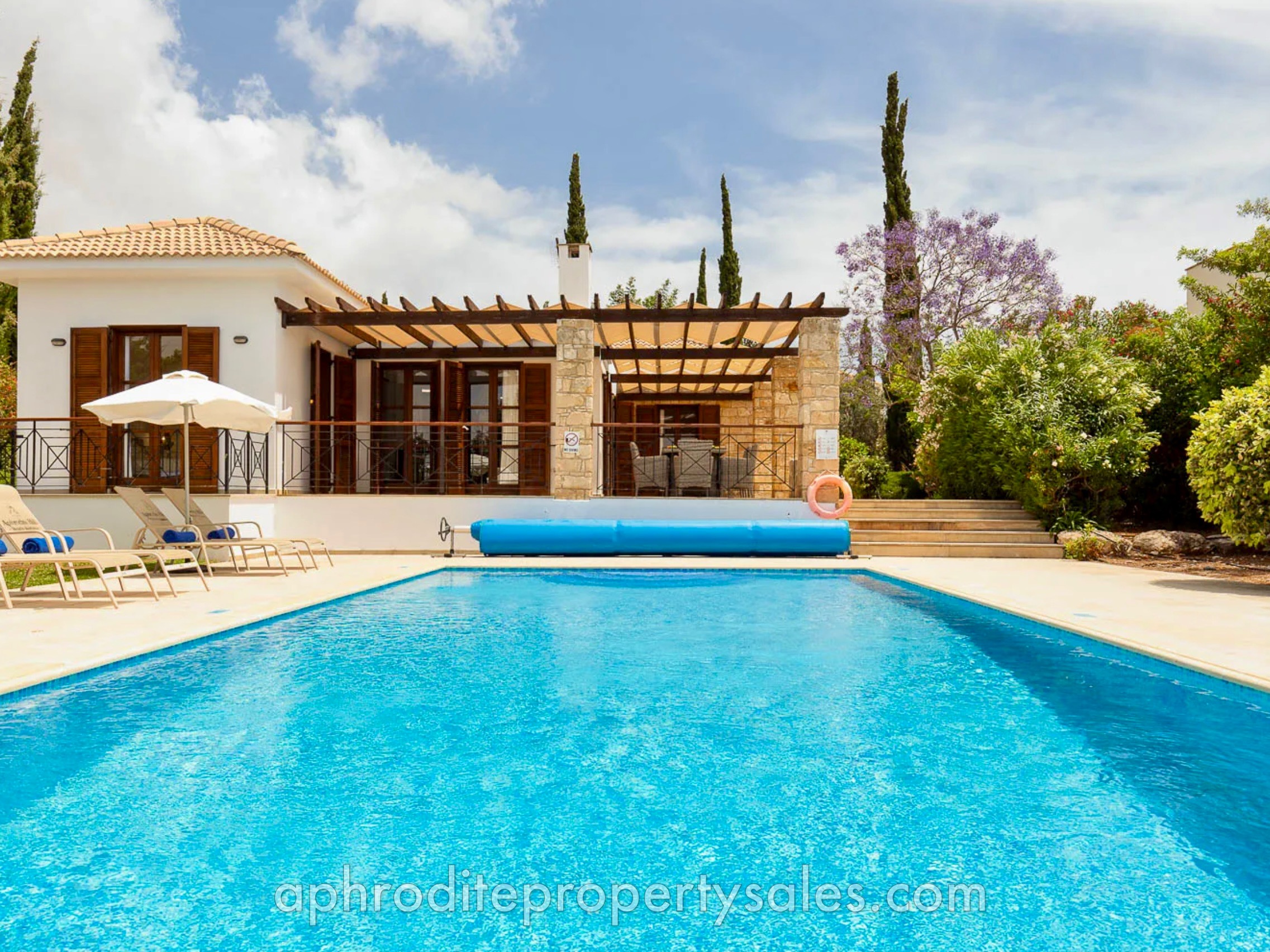 Situated in a spacious and mature plot of 1360 sqm overlooking the first hole of the golf course, this attractive 3 double bedroom villa has a 10m x 5m heated swimming pool and a mature well stocked garden giving privacy and shade. The modern open plan living space provides a welcoming bright and spacious environment for enjoying the perfect Cyprus climate with central heating installed for those chillier winter’s evenings.
