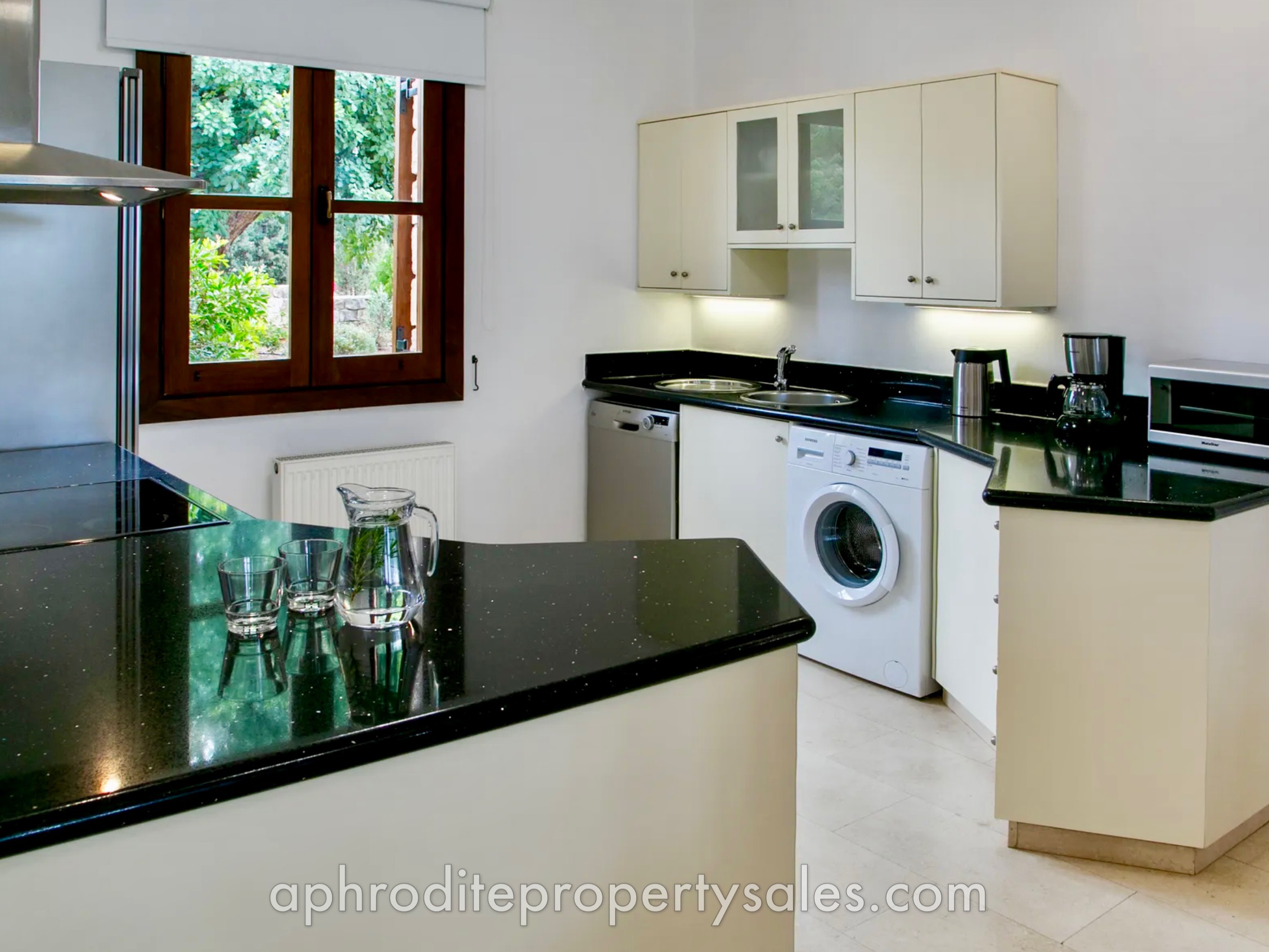 On entering the villa you feel a warm atmosphere provided by the attractive solid wood glazed doors and the open fireplace giving its focal point. To one side is the modern open plan kitchen which is well fitted with granite worktops and quality appliances.