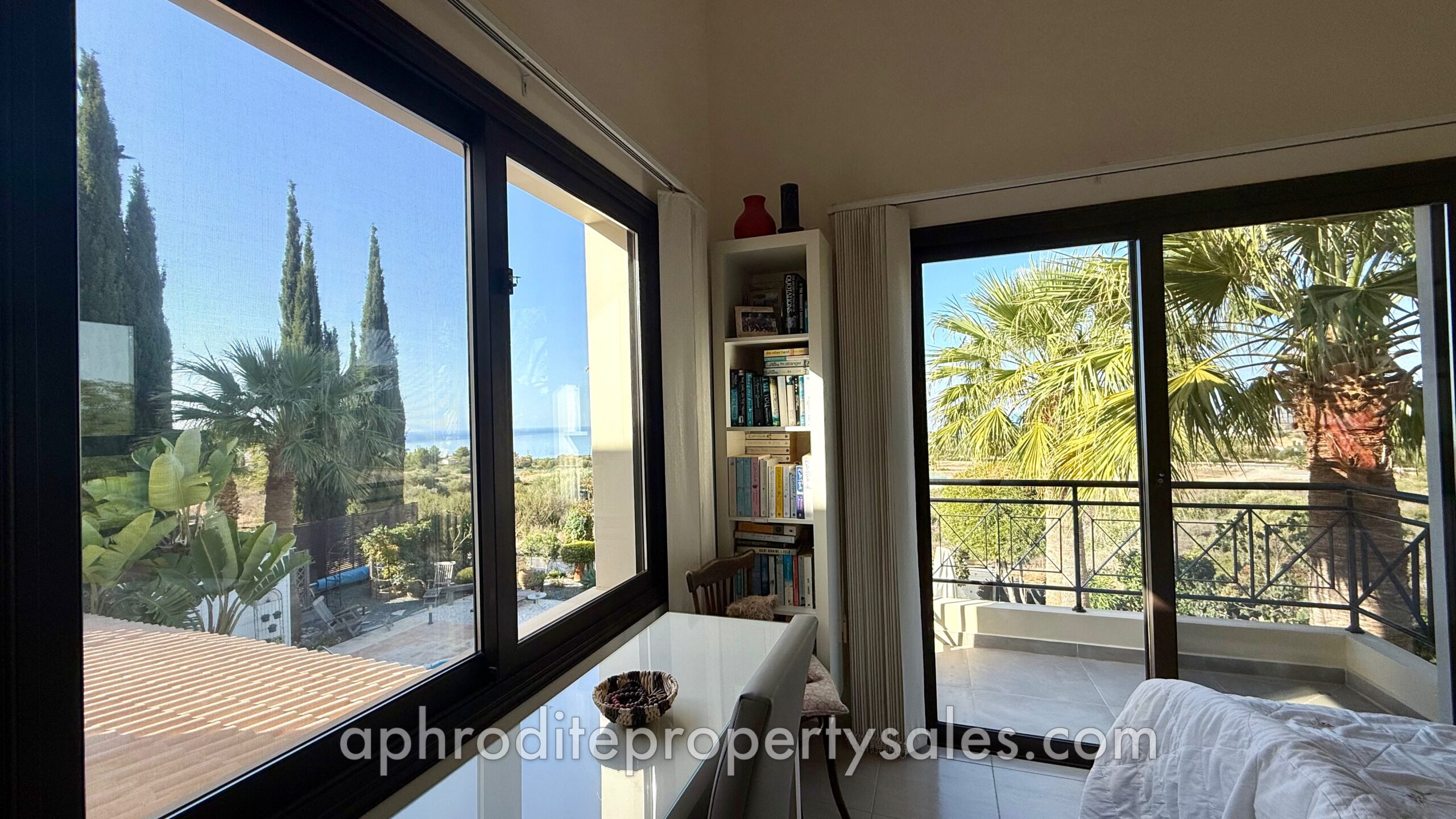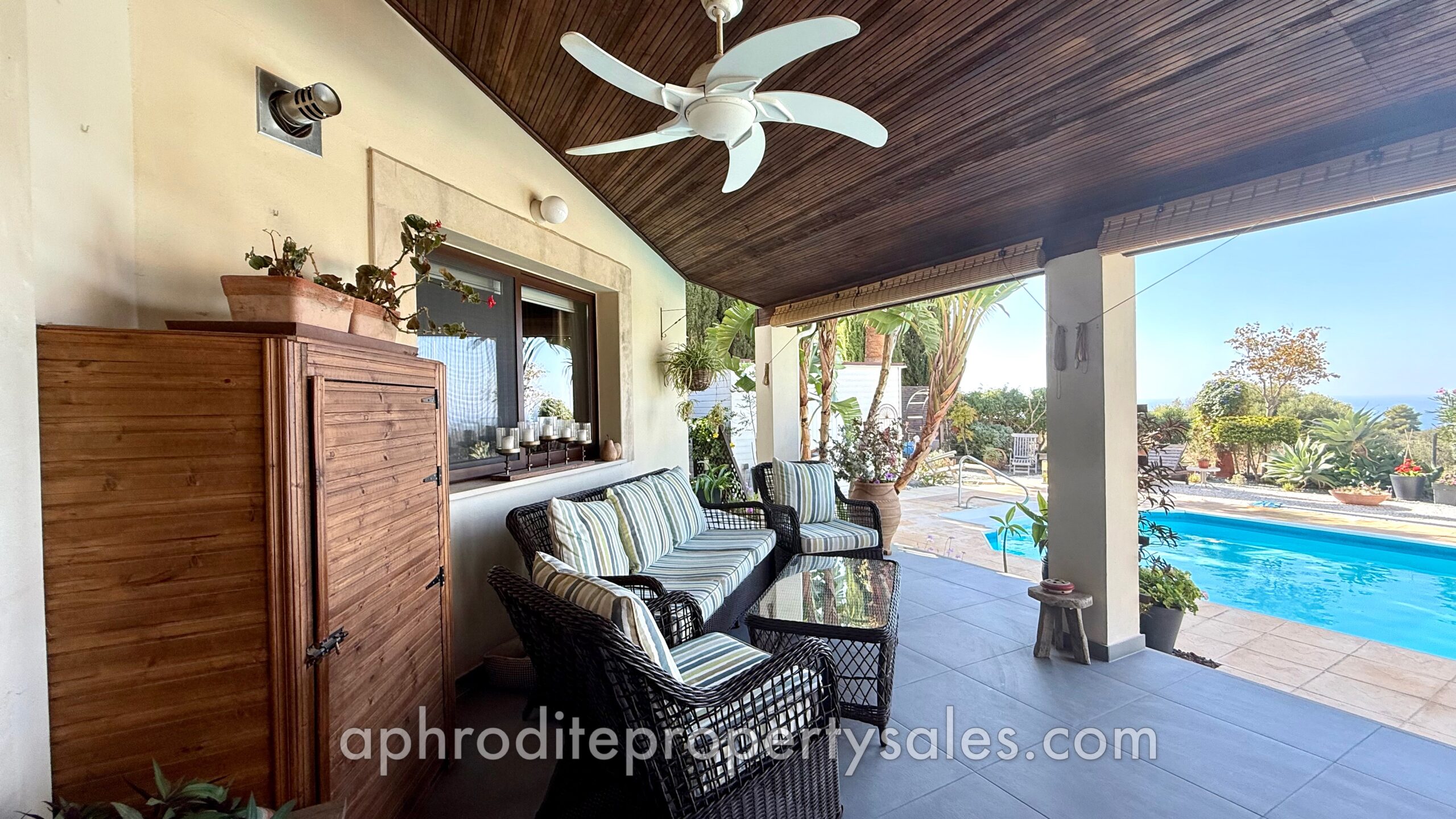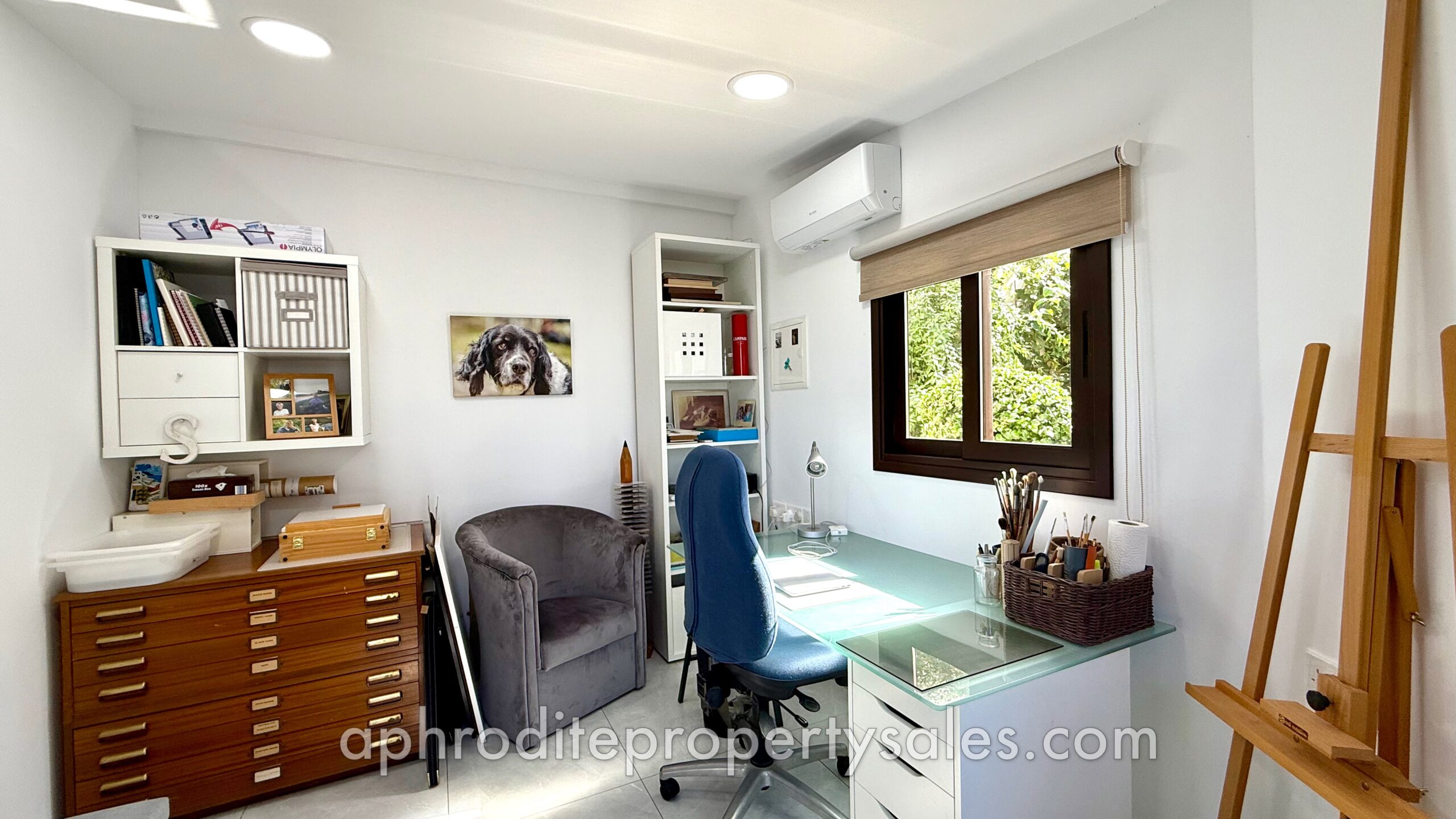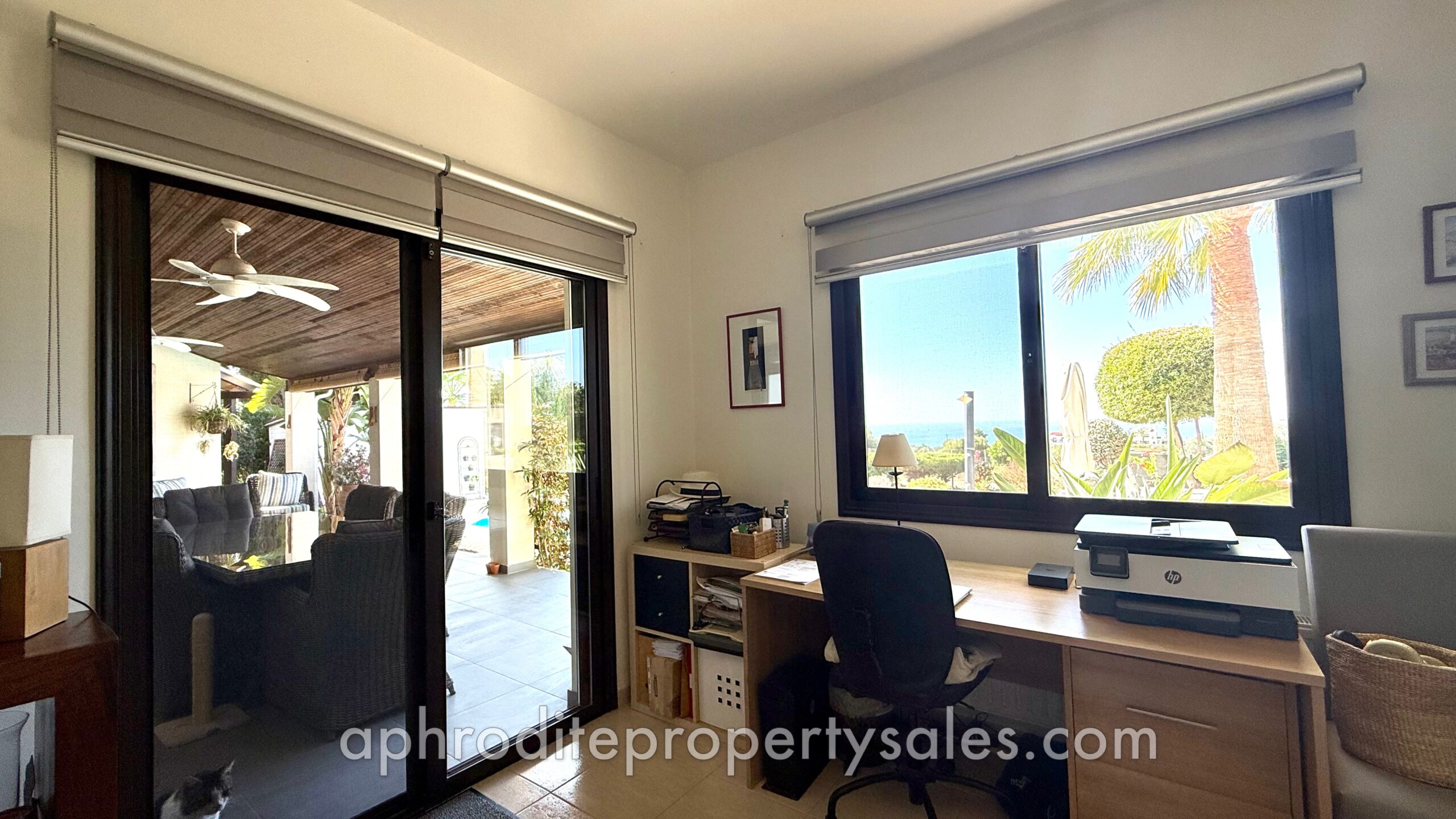 Separated by a shelf partition from the kitchen is a good sized study with room for a sofa bed which has sliding doors onto the covered terrace. This large covered terrace can be used all year round and has ceiling fans, blinds and space for plenty of dedicated spaces for sitting and dining areas. Sitting in this terrace enables you to enjoy panoramic sea views at ground floor level and from all rooms in the villa.