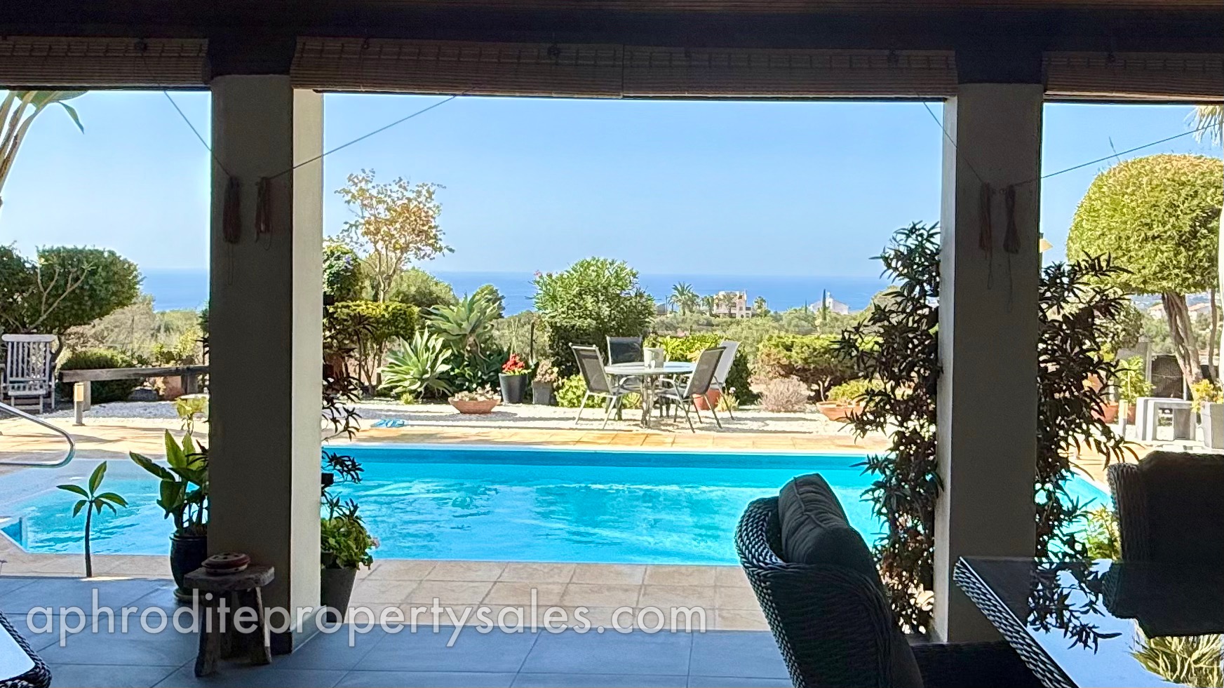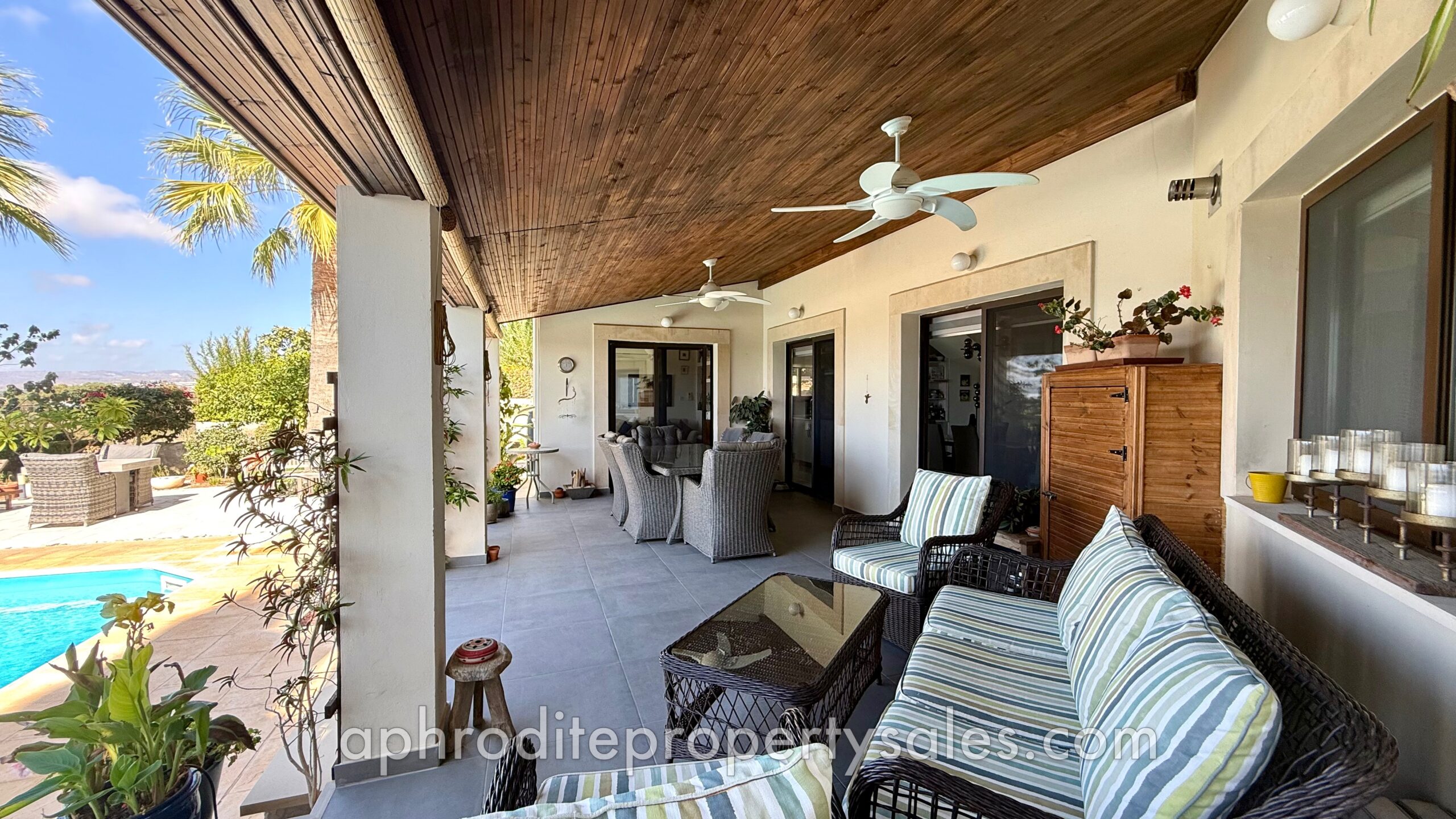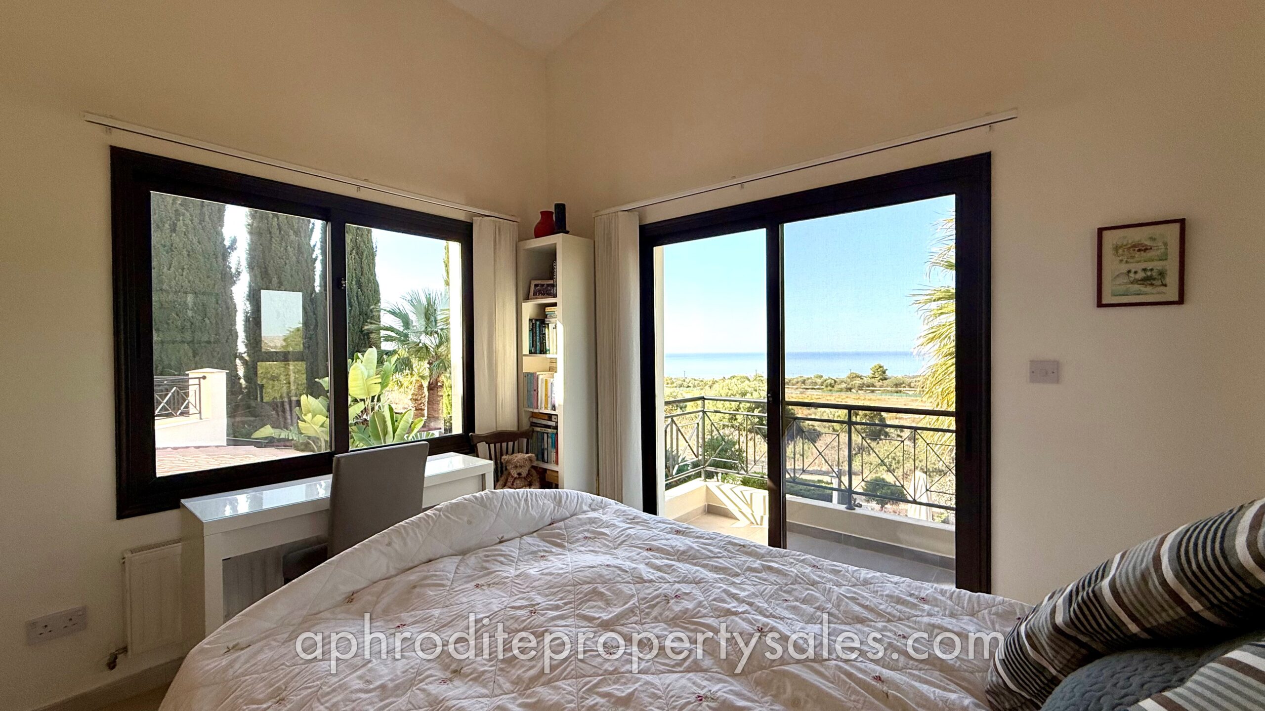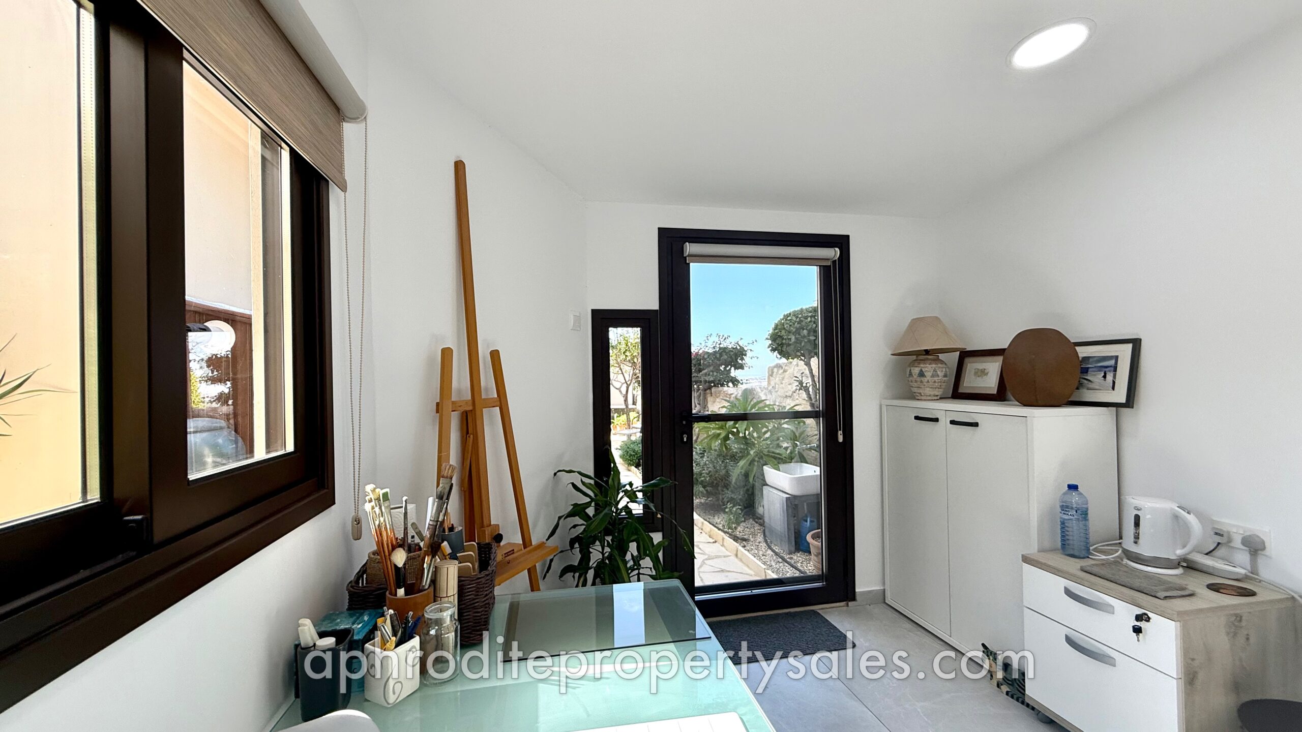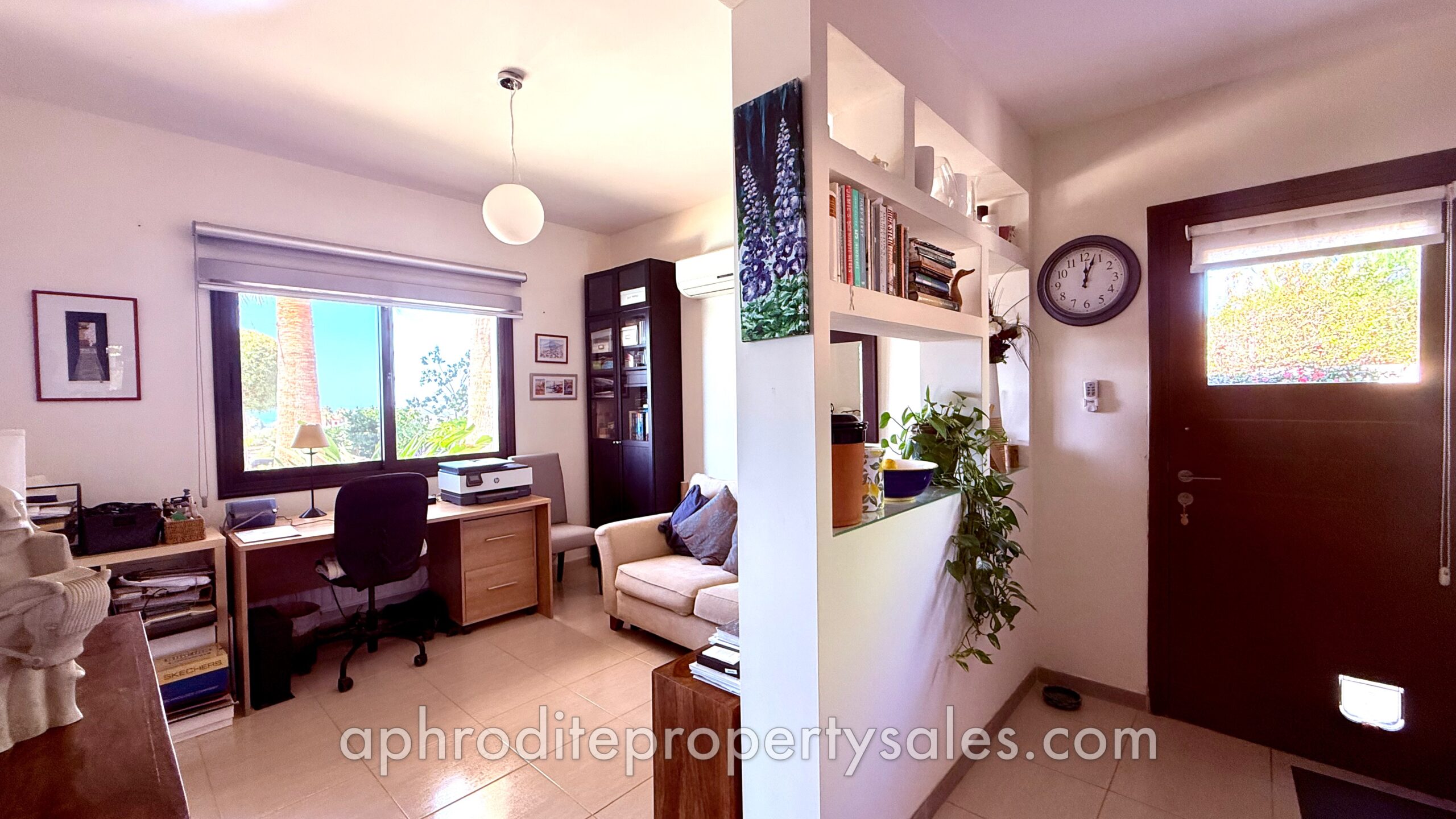 Separated by a shelf partition from the kitchen is a good sized study with room for a sofa bed which has sliding doors onto the covered terrace. This large covered terrace can be used all year round and has ceiling fans, blinds and space for plenty of dedicated spaces for sitting and dining areas. Sitting in this terrace enables you to enjoy panoramic sea views at ground floor level and from all rooms in the villa.