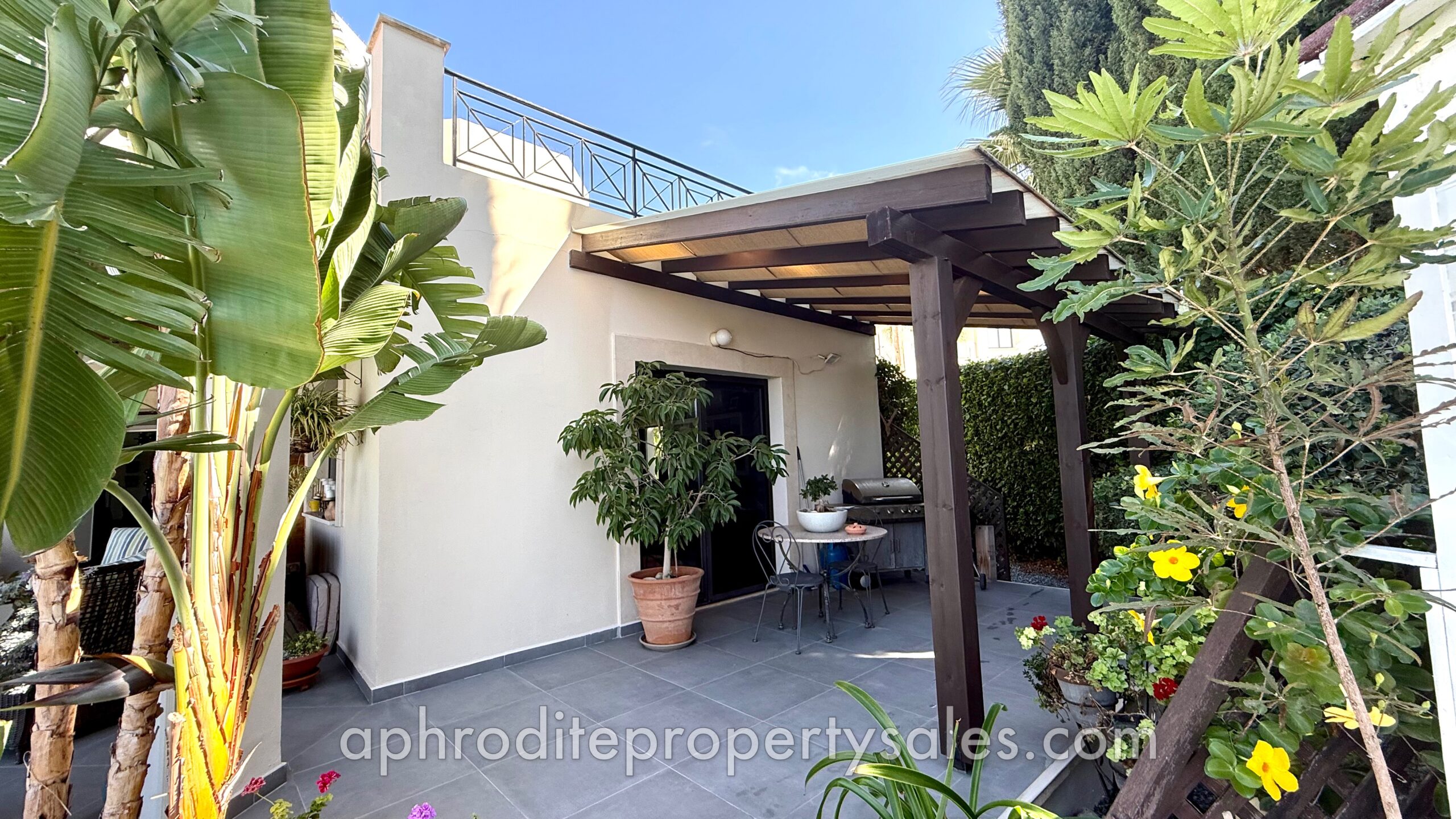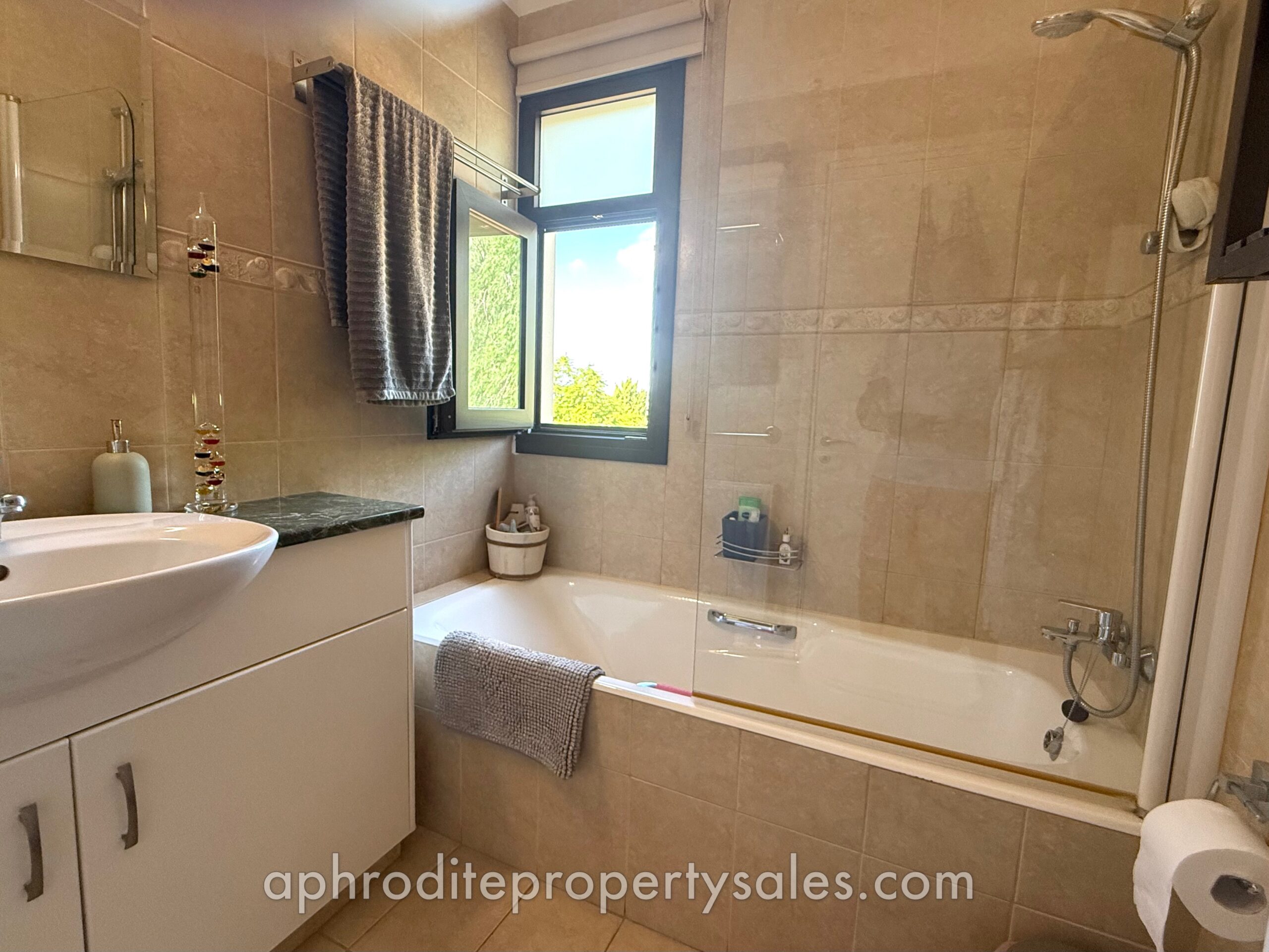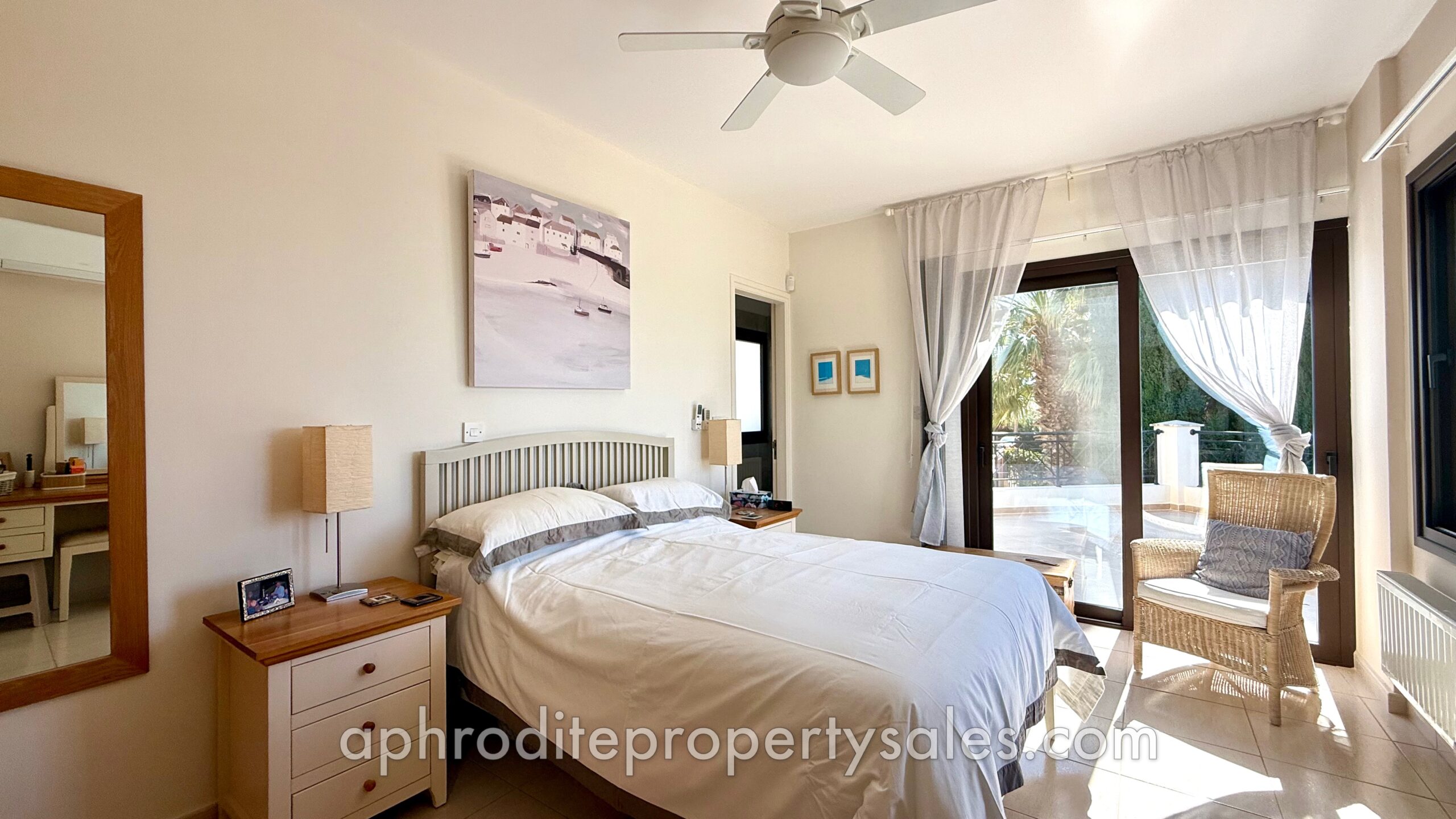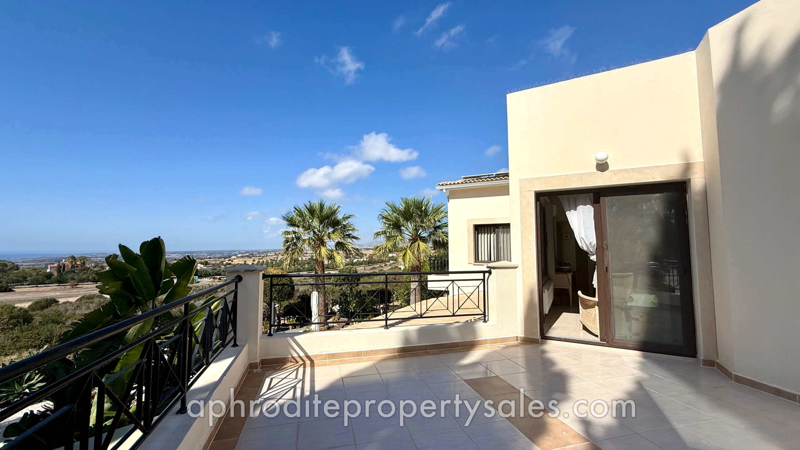 Separated by a shelf partition from the kitchen is a good sized study with room for a sofa bed which has sliding doors onto the covered terrace. This large covered terrace can be used all year round and has ceiling fans, blinds and space for plenty of dedicated spaces for sitting and dining areas. Sitting in this terrace enables you to enjoy panoramic sea views at ground floor level and from all rooms in the villa.