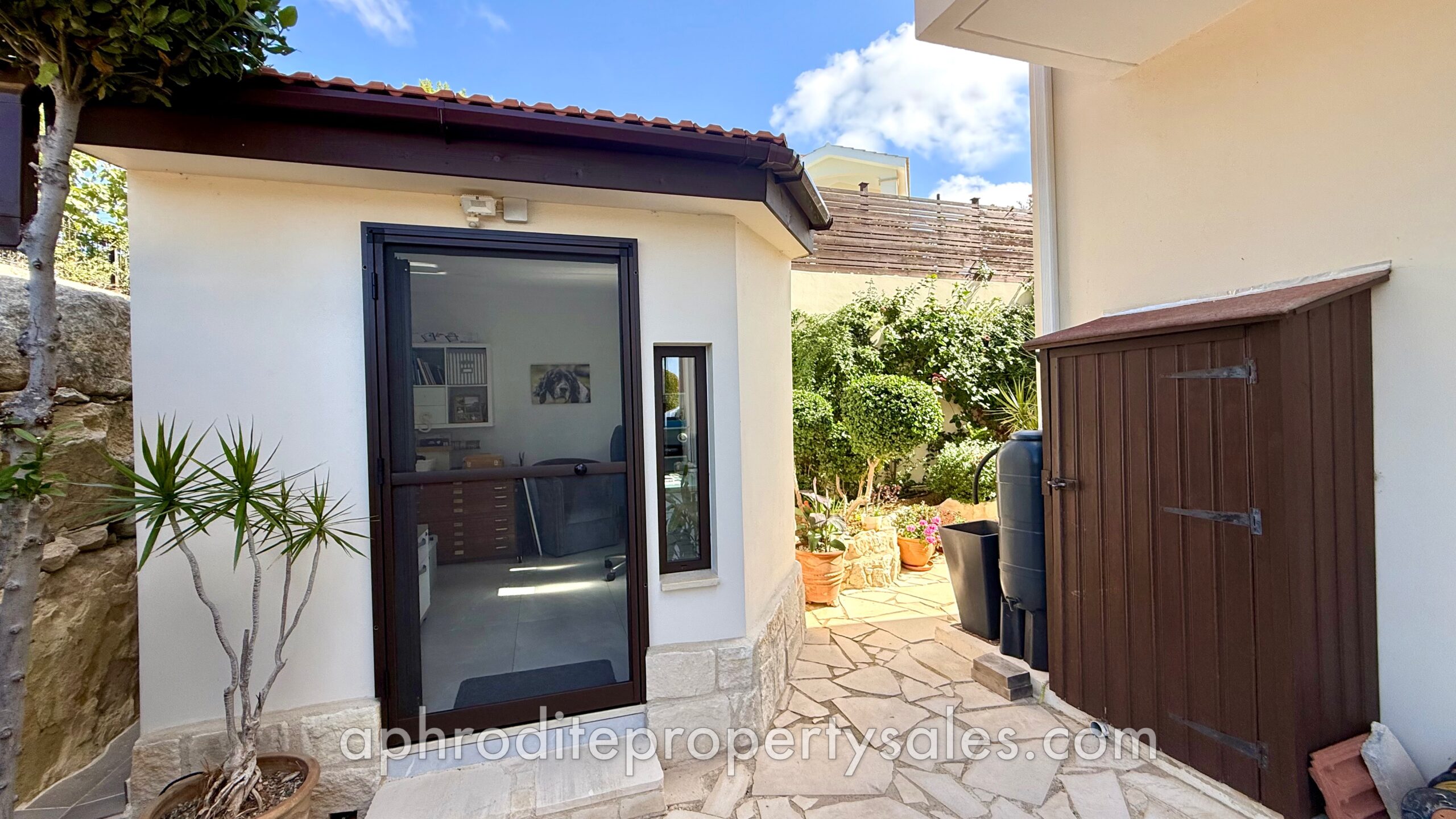 An office/artist’s studio room has recently been well constructed in a corner of the garden with insulation and air conditioning giving an additional well planned work or leisure space.