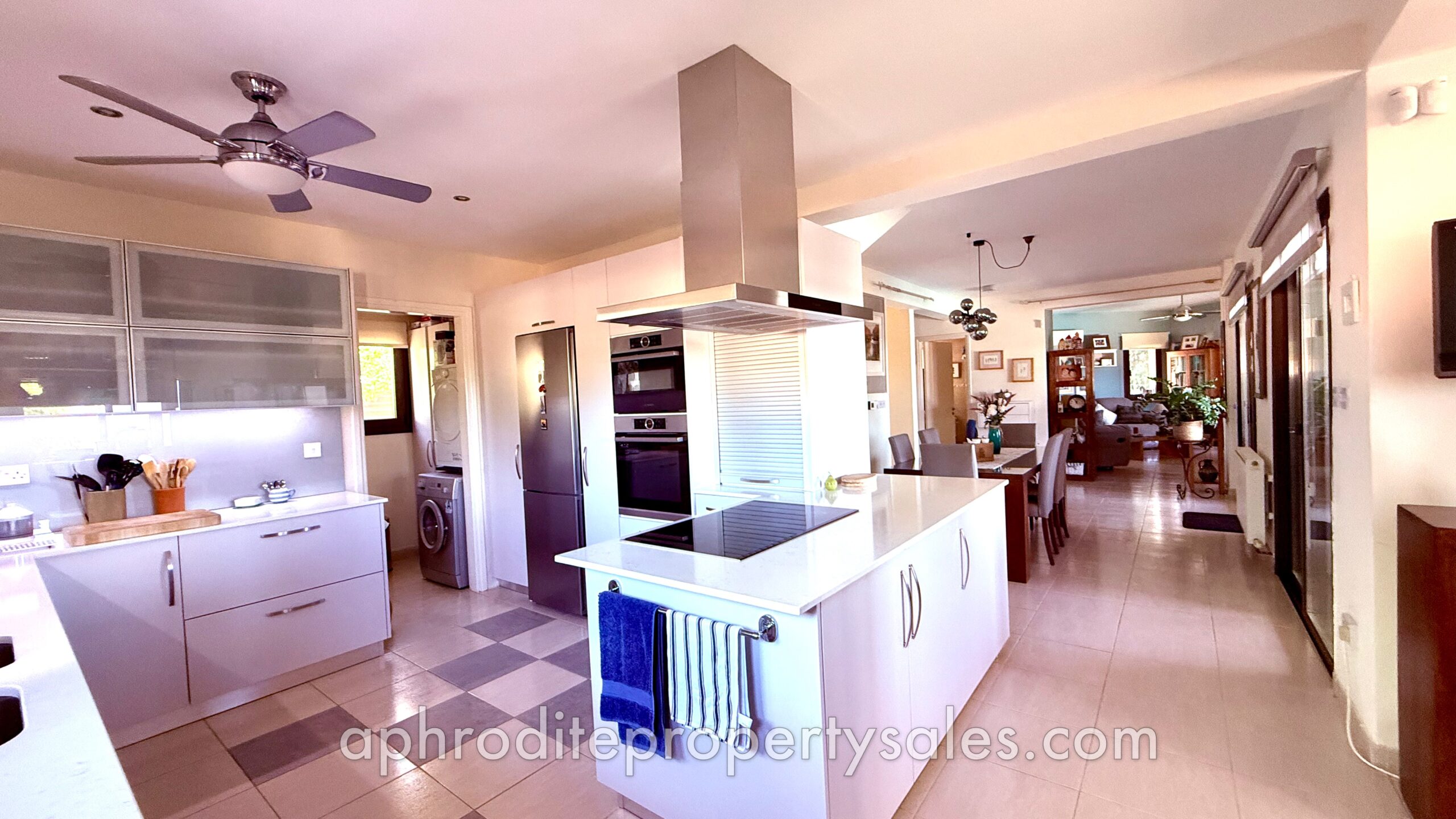 Approached from the corner of a quiet cul de sac with a covered parking area, the large ground floor accommodation comprises an entrance hallway with guest cloakroom leading into a large dining area with sliding doors on to the covered terrace. To the left is a spacious sitting room with sliding doors to a side covered terrace and a feature wood burning stove to give those chillier winter’s evenings a warm cosiness. The dining area can house a table for 8 with understairs storage for an extra fridge and wine. This opens up into a newly fitted open plan kitchen with feature cooking peninsula hob and hood. Granite work surfaces are fitted throughout with multiple built in quality appliances. A utility room with space for washer and dryer with sink and cupboards completes this area.