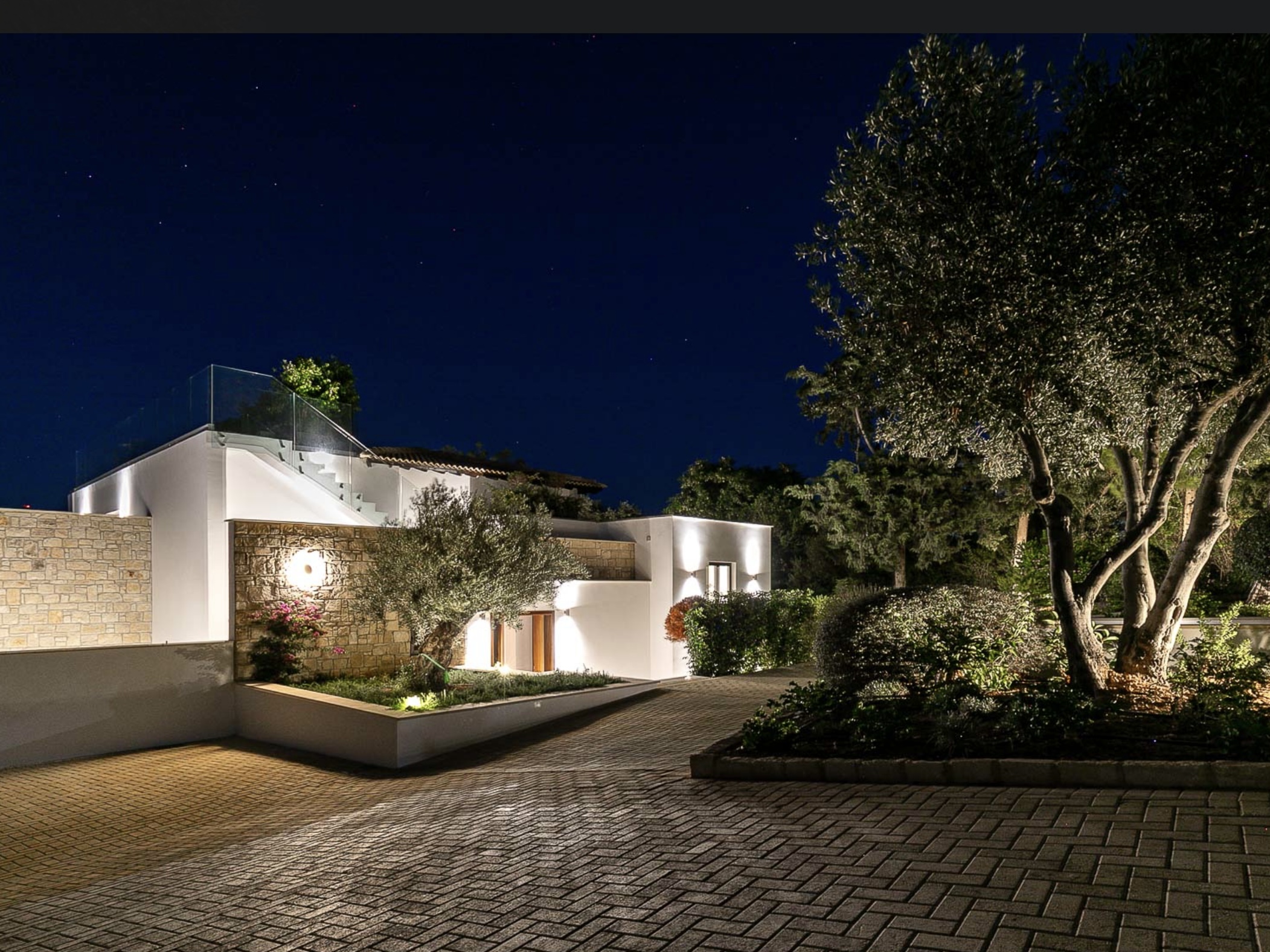 The gated entrance leads to a landscaped driveway, with parking for 3 or more cars. Steps lead down to the grand front door and as you enter the villa you have the luxury of the lights coming on in the entrance and living spaces. On this level there is a guest W/C and enclosed storage, stairs lead off to the upstairs bedrooms and down to another double bedroom and the utility room, which has Miele appliances and a separate entrance from the outside. The spectacular designed Serip chandelier, takes centre stage, in the high ceiling.