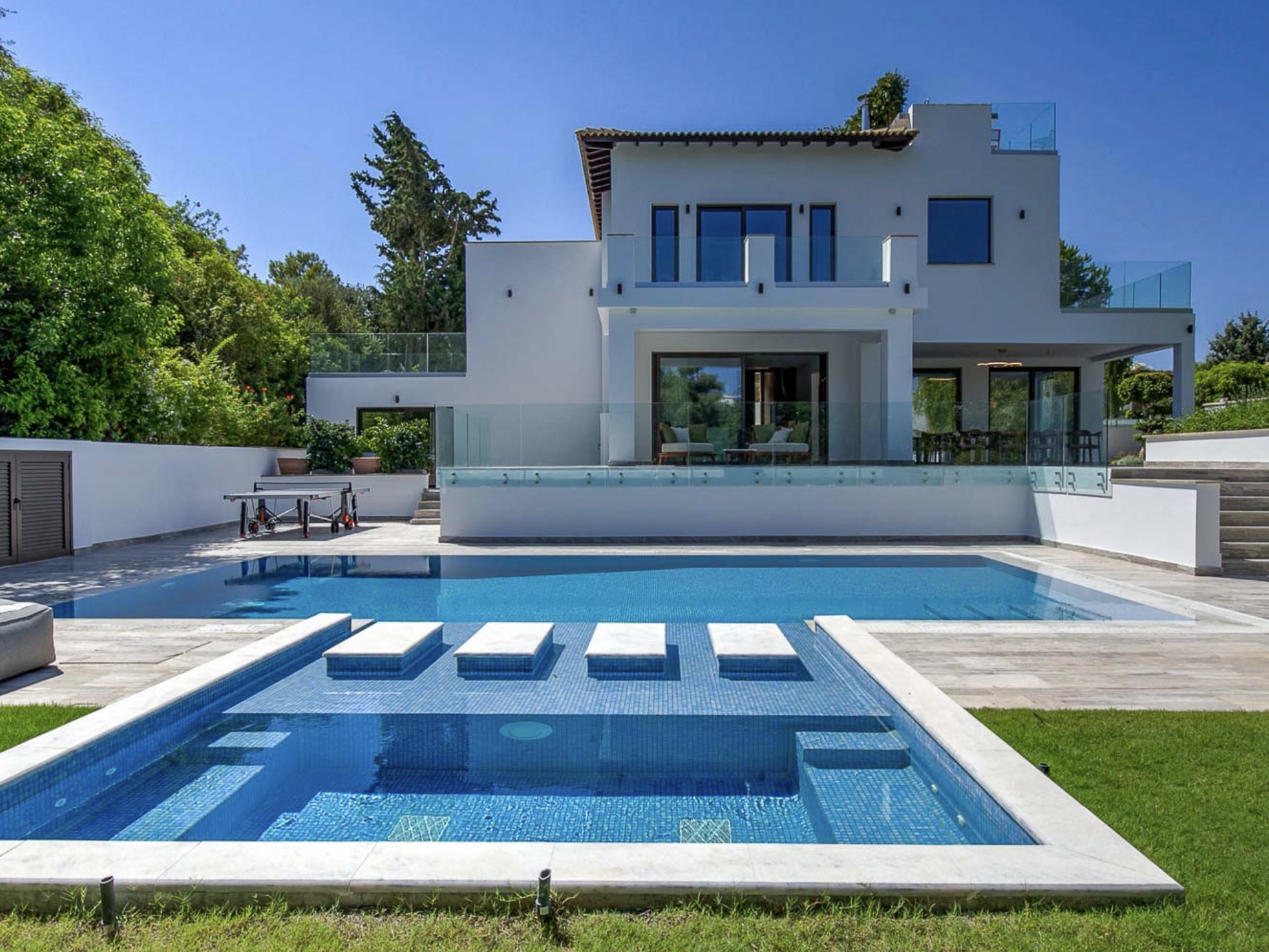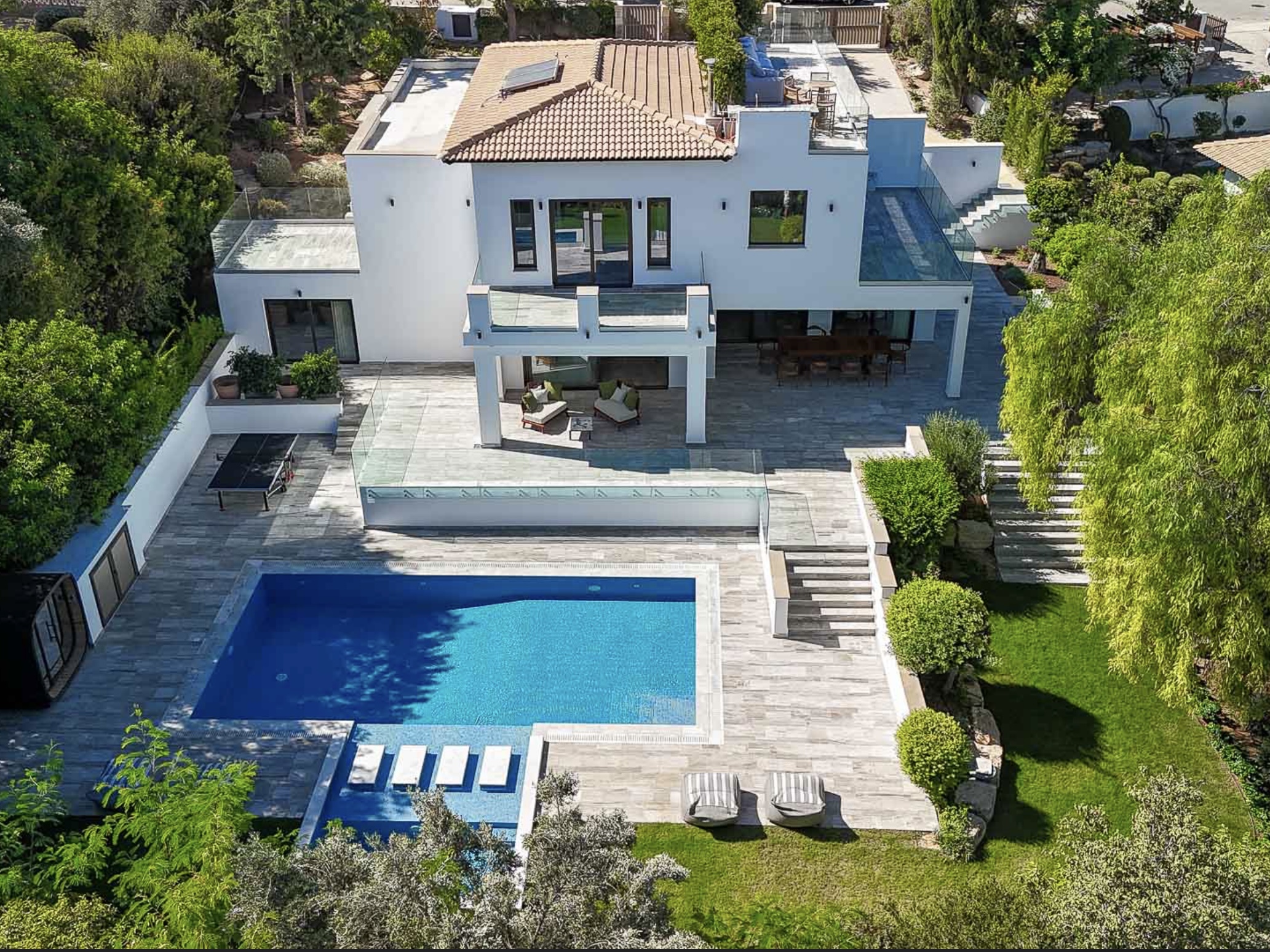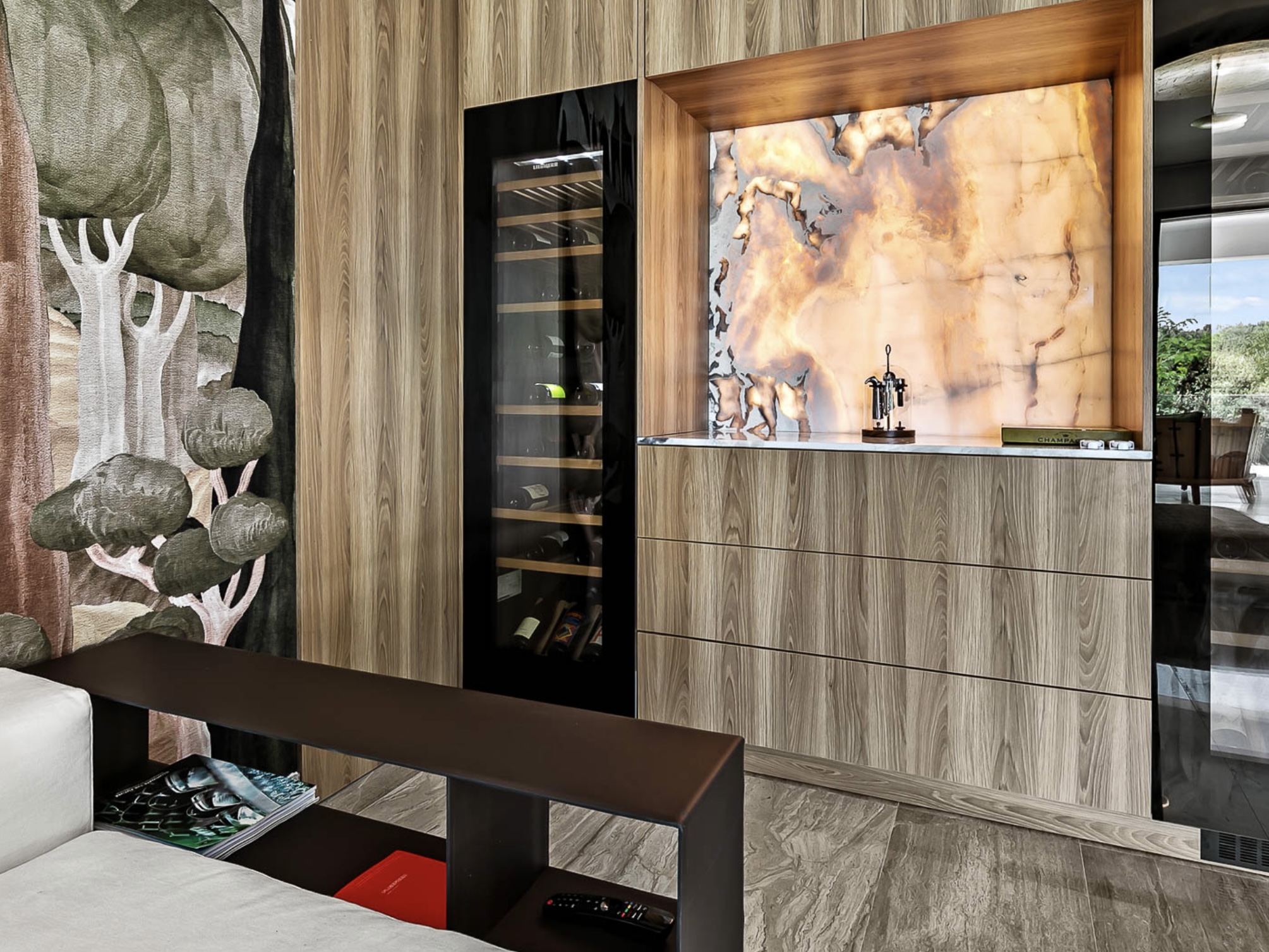 The living room with its stunning feature wall, decorated with designer wallpaper, has a double sided fireplace, which also takes in the outside dining terrace. There is a beautifully designed bar with wine storage (professional liebherr wine fridges). Rimadesio, full length sliding doors lead out onto a covered terrace looking over the swimming pool and beautifully manicured garden.
