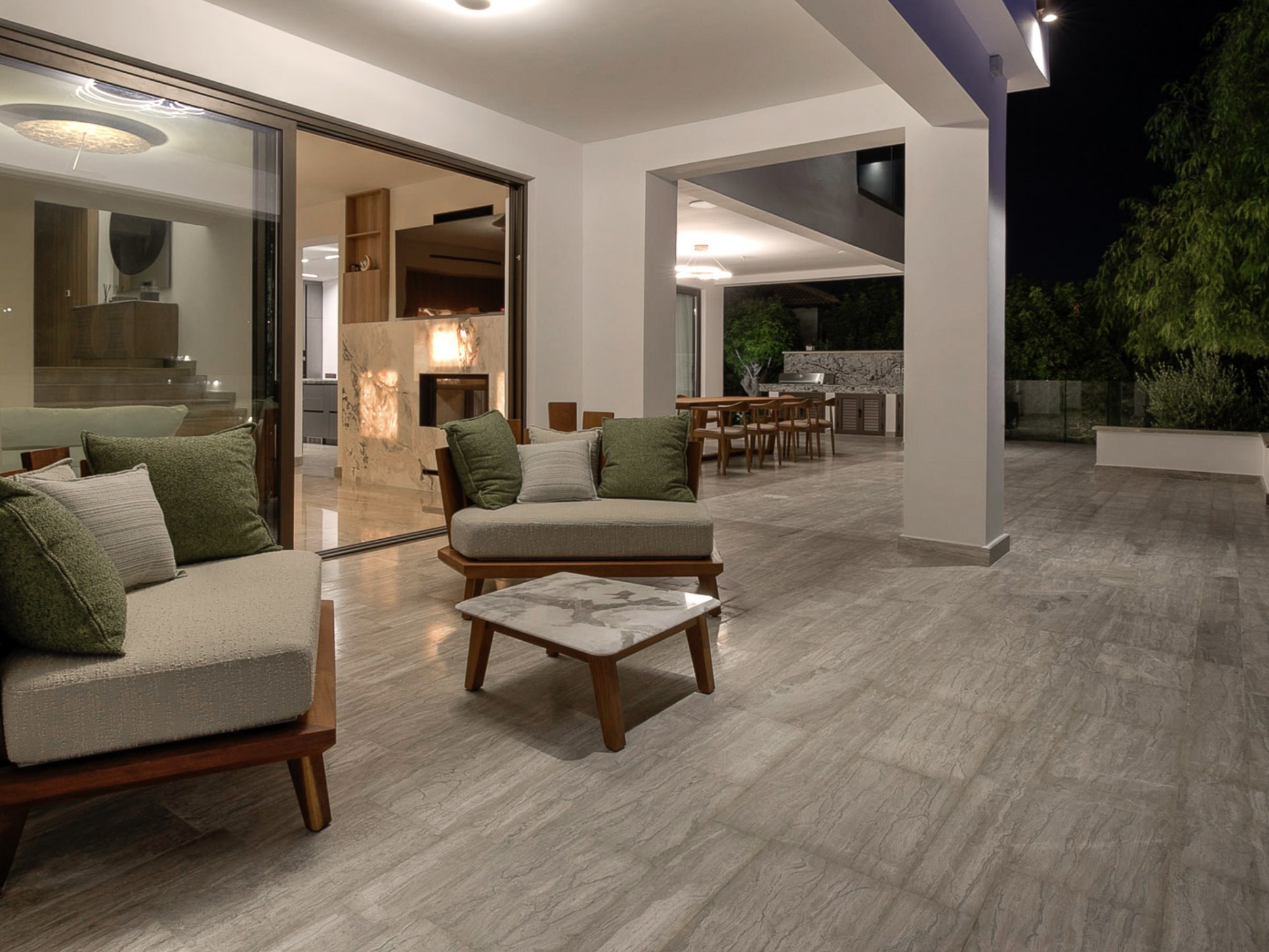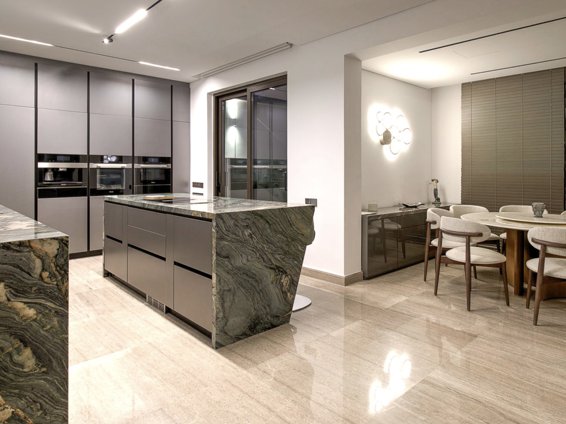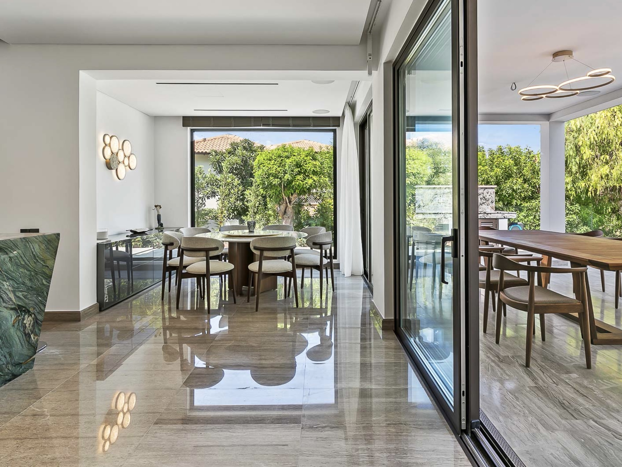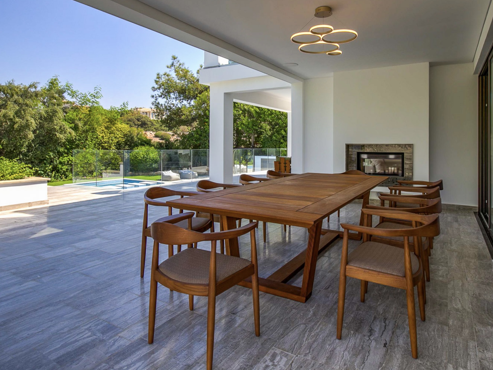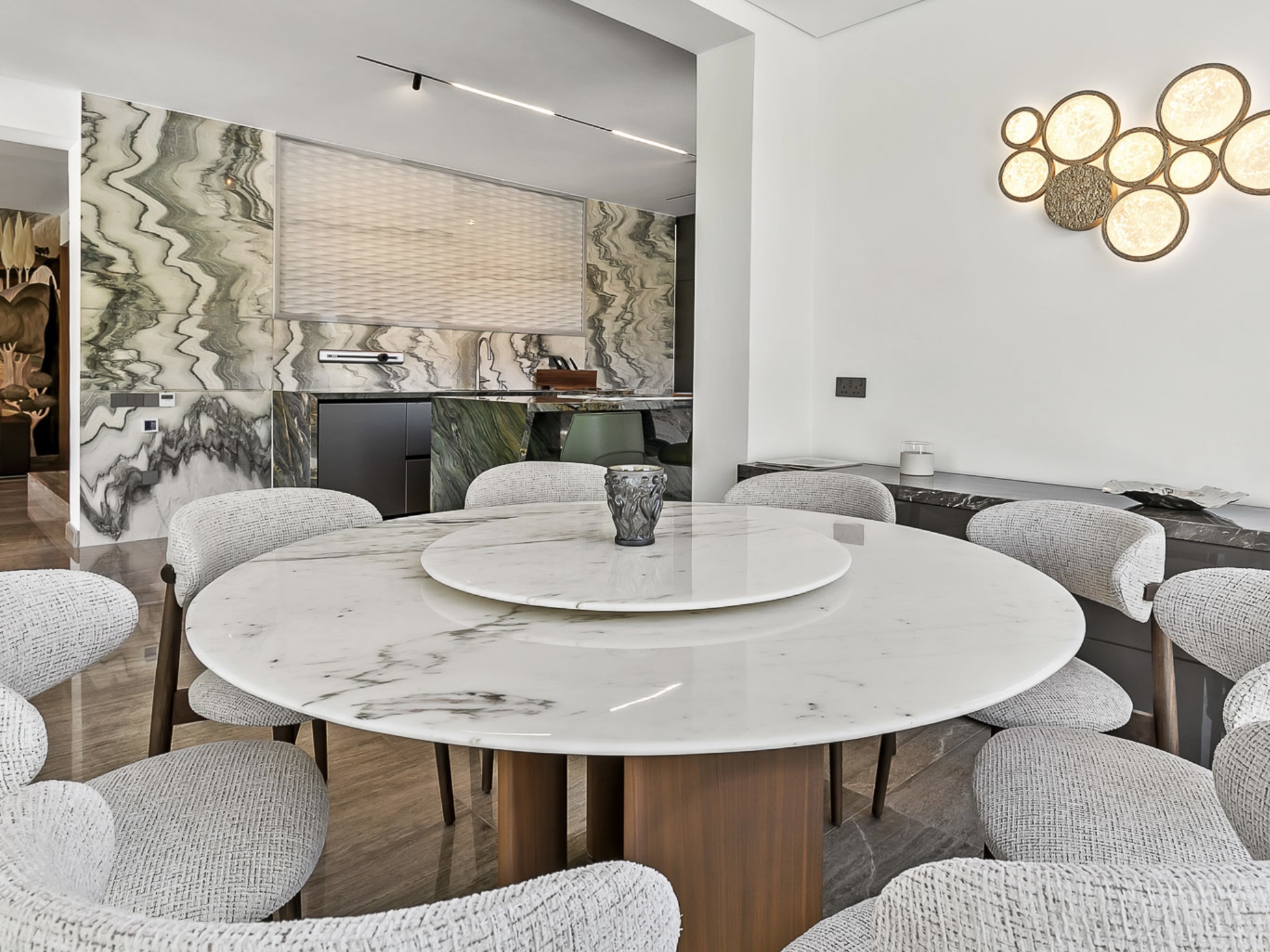 The Italian designed kitchen, with built in appliances, integrated hob and two ovens also has a magnificent natural quartzite island and worktops. A stunning Onyx dining table which seats 8 people sits effortlessly, with a Bowers & Wilkins built in-ceiling audio system adding to the dining experience. Rimadesio full length sliding doors with motorized curtains and venetian blinds, lead out onto a covered terrace with outdoor dining area, an elegant dining table and ultra modern pendant light fitting with the shared indoor outdoor fireplace. BBQ and outside kitchen .